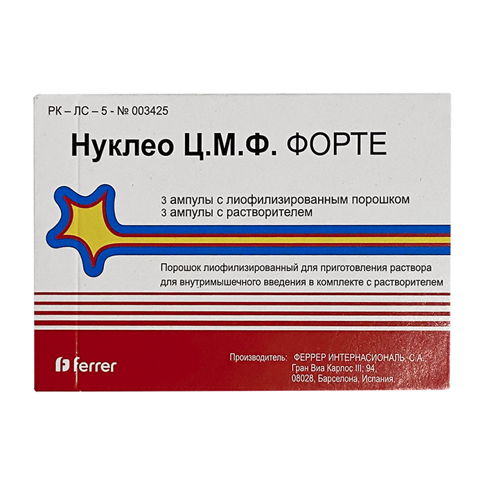Нуклео Ц.М.Ф. Форте, инъекции, предназначенный для внутримышечного введения. Перед введением необходимо растворитель перенести в ампулу с лиофилизированным порошком.
